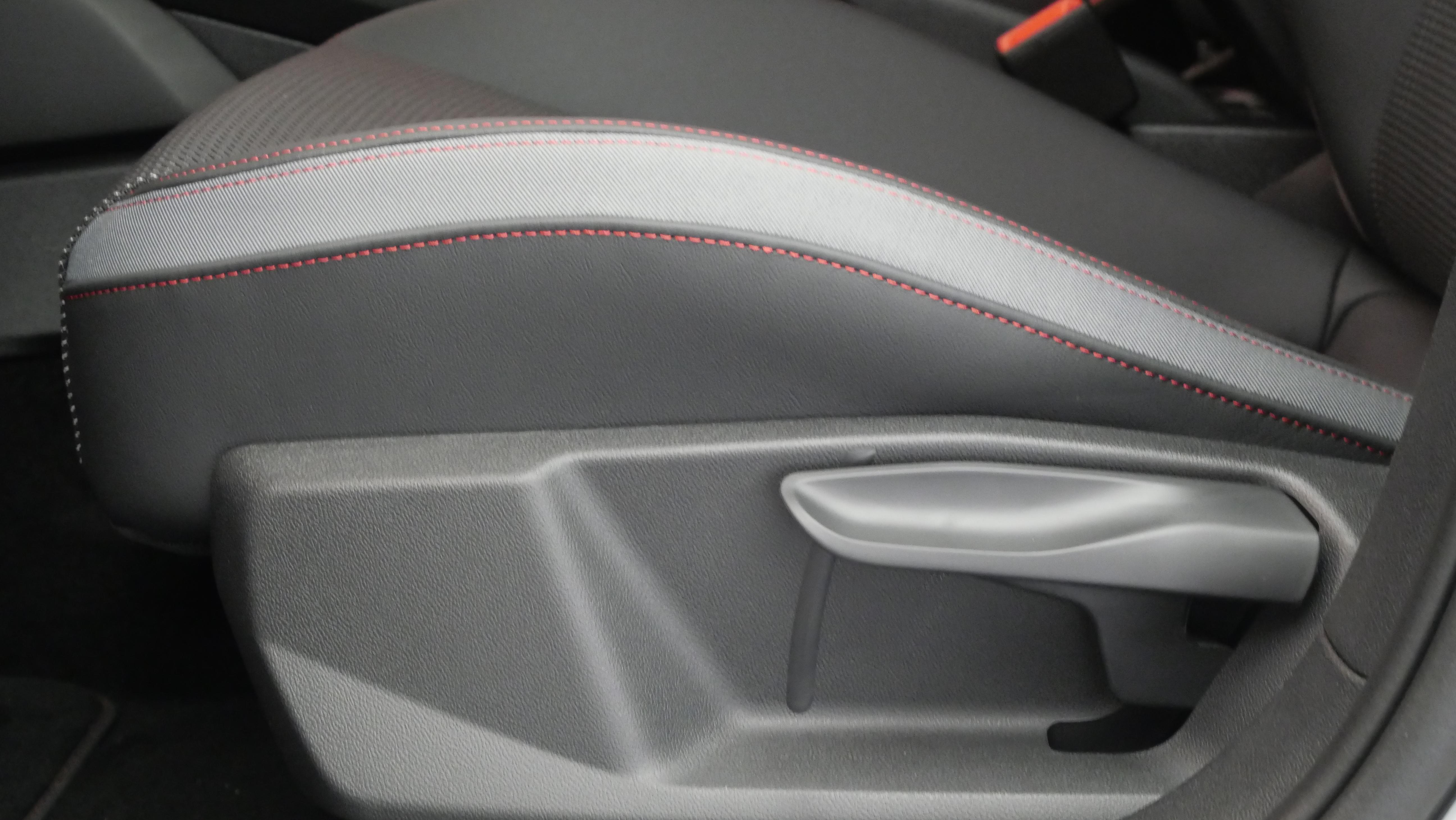 • Sièges Sport cuir/tissu avec surpiqûre contrastée et estampillage S sur le dossier des sièges AV Avec appui lombaire manuel à 2 axes. Avec bourrelets latéraux enveloppants pour un meilleur maintien en virage.